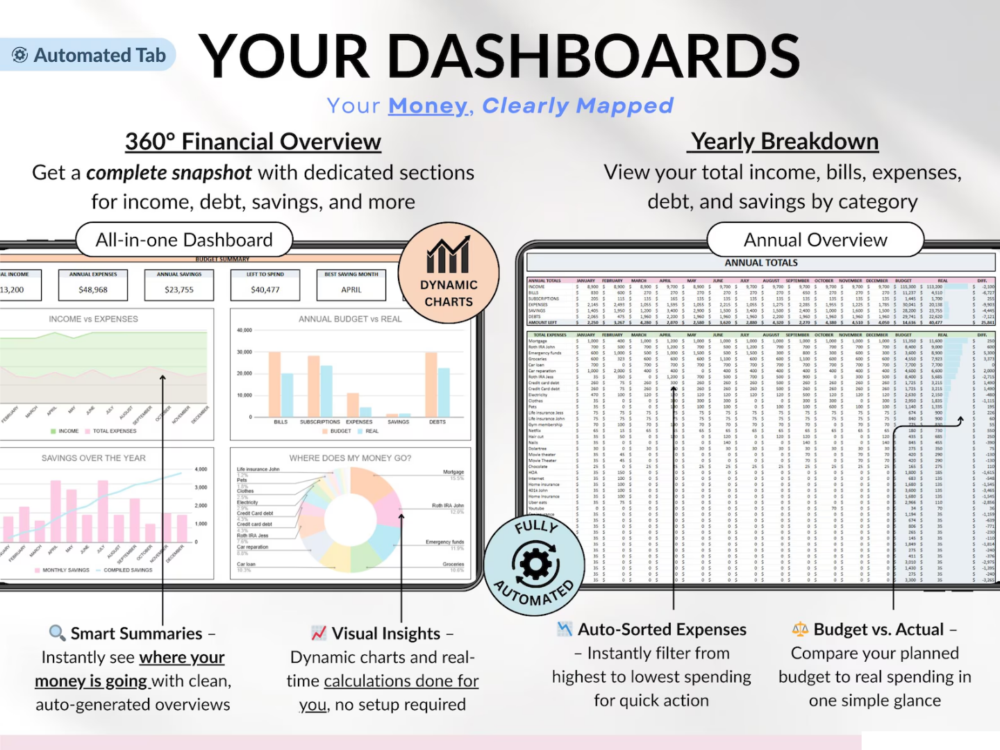 👨👩👧 Track your entire year with 23 powerful tabs: monthly budgets, sinking funds, debt tracker, net worth & more.