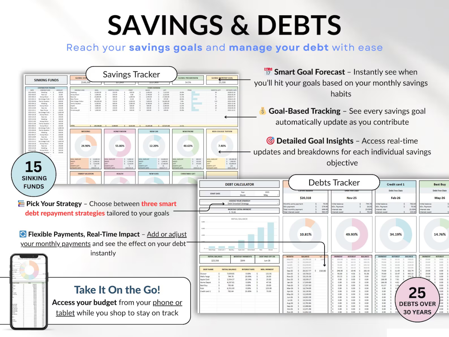 Manage every part of your financial future with dedicated sheets for debt payoff, emergency savings, sinking funds, investments, and more.