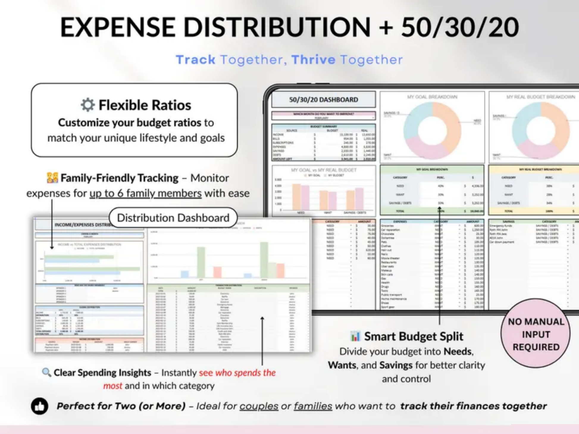 📊 All-in-one dashboards to monitor spending, savings, income distribution, and long-term financial progress.