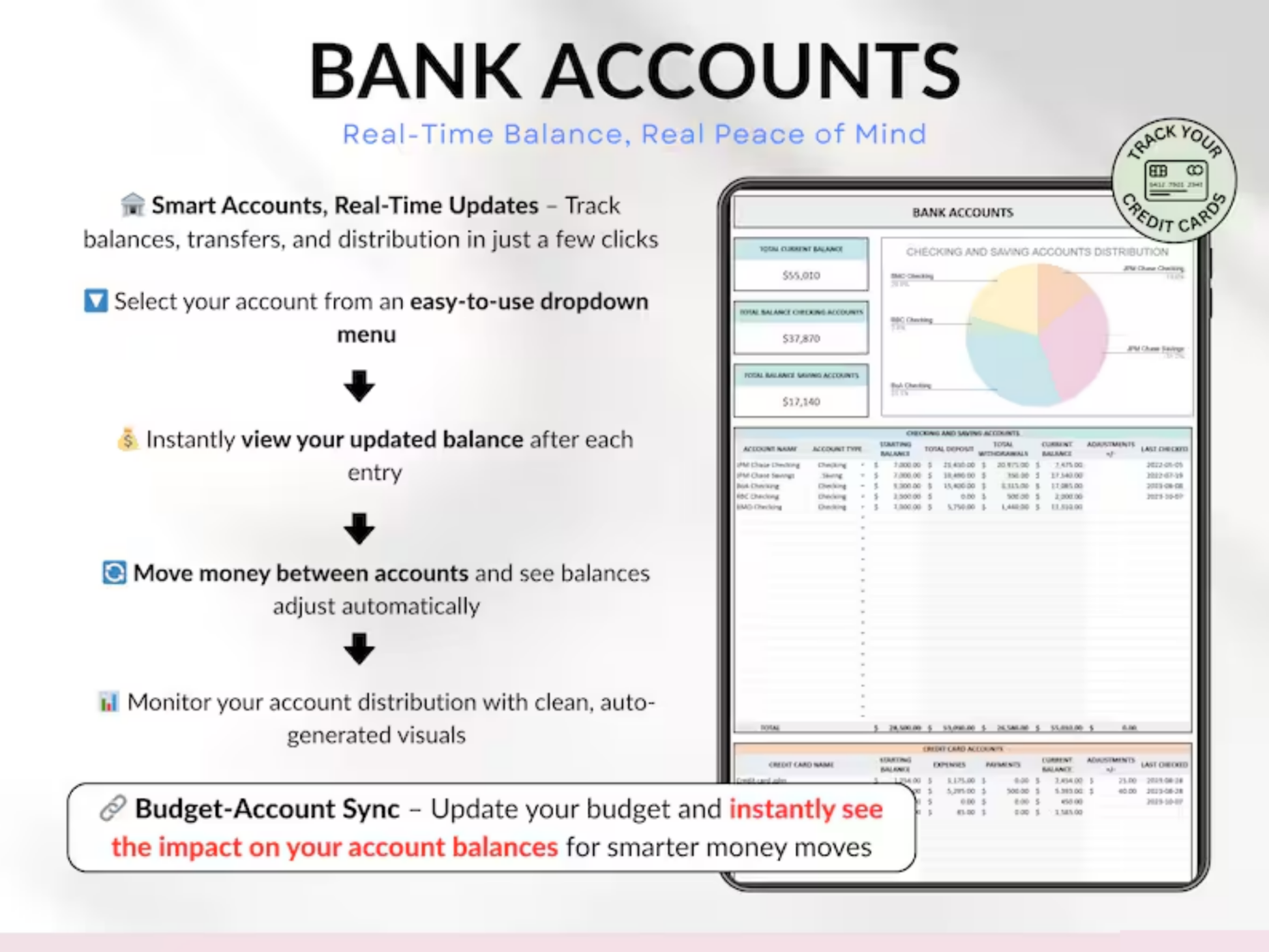 Track income, expenses, monthly budgets, account balances, category distribution, and overall financial progress, all updated for you in real time, month after month.
